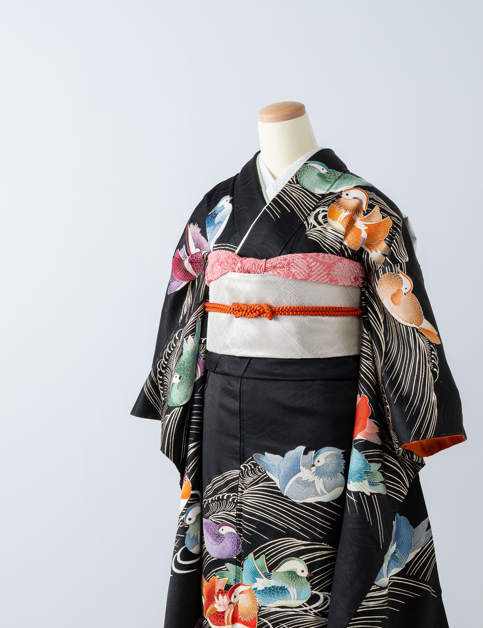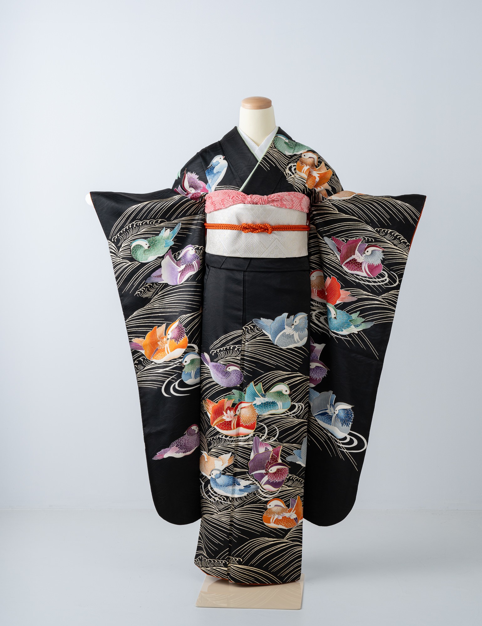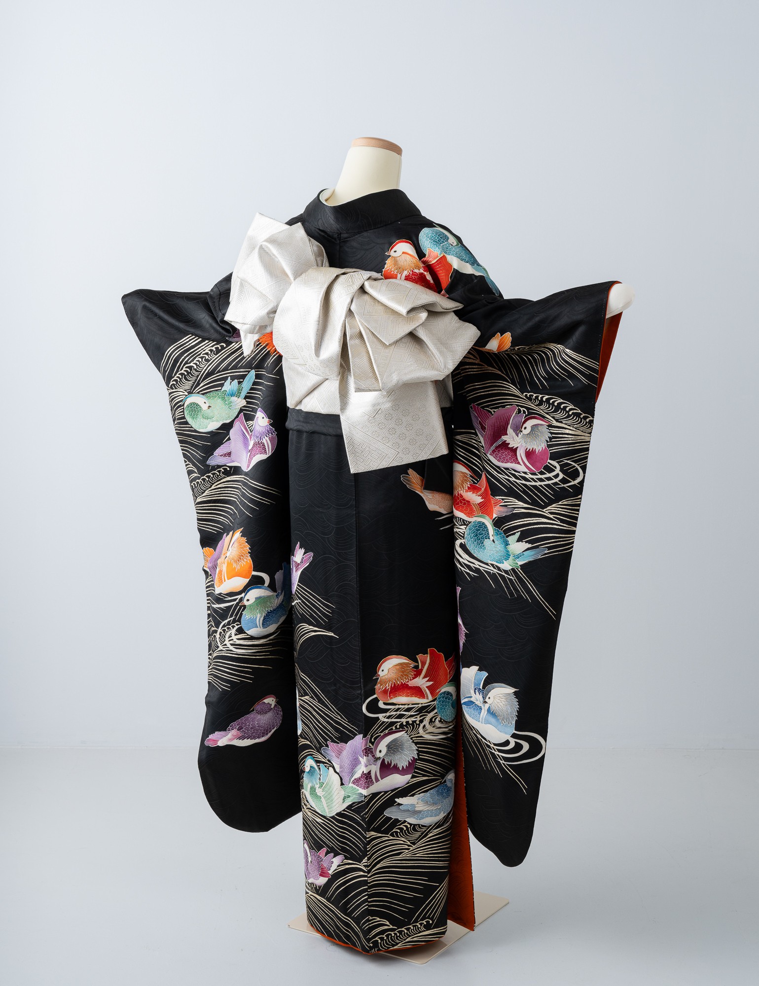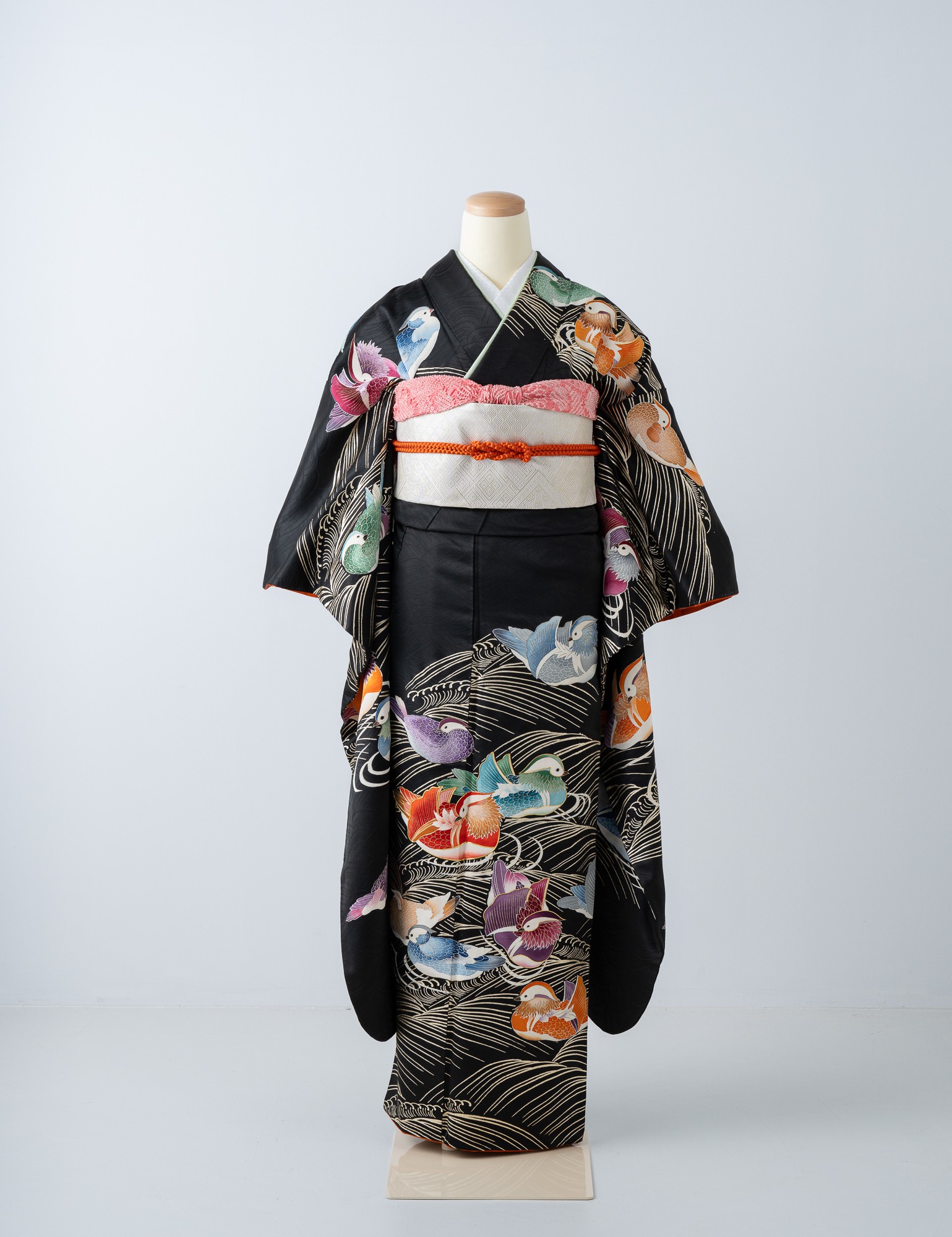 流水に鴛鴦(おしどり)が色とりどりに描かれた黒振袖です。鳥たちの思いおもいに浮かぶ姿がかわいらしく、和やかな雰囲気の装いに。