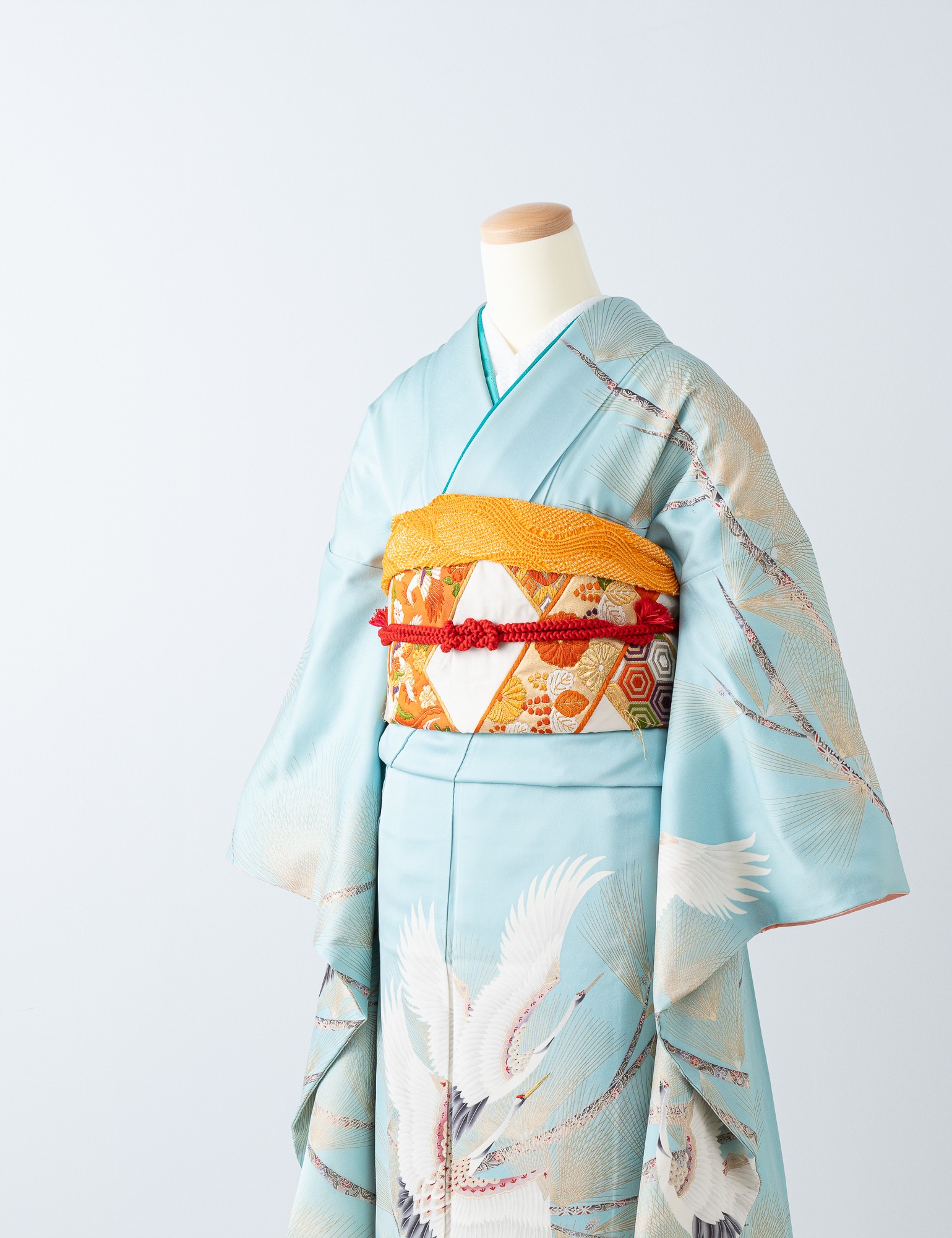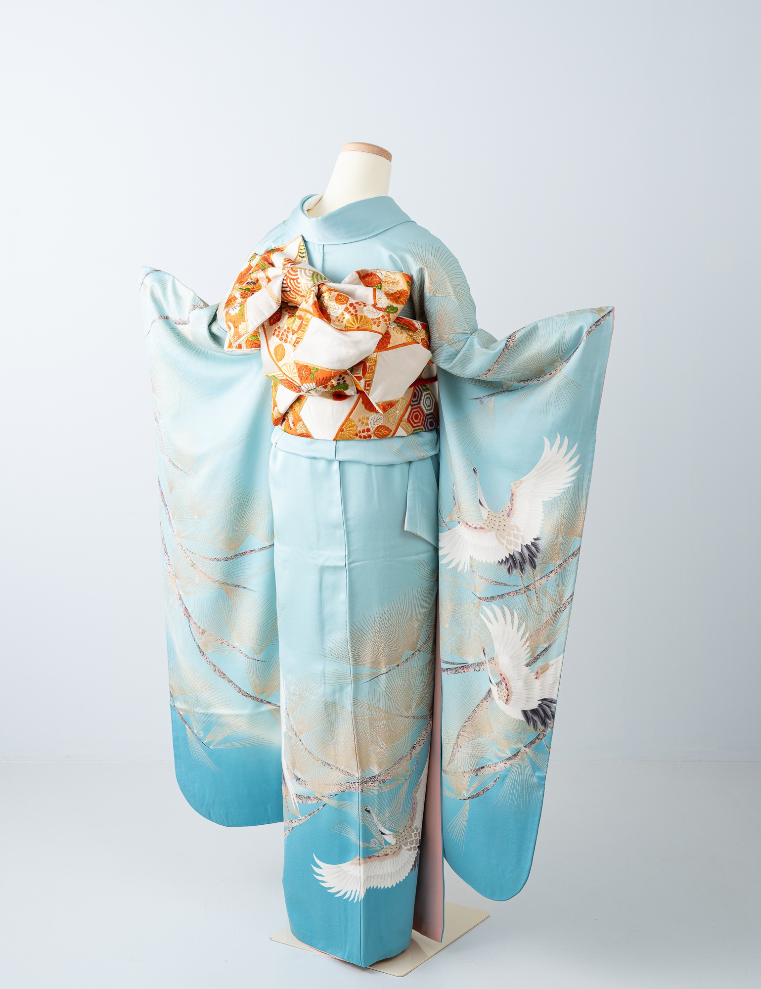 ブルーのグラデーションと飛鶴文が印象的なぼかし染めの振袖。松の葉や羽ばたく鶴は金に彩られ、繊細優美に描かれています。