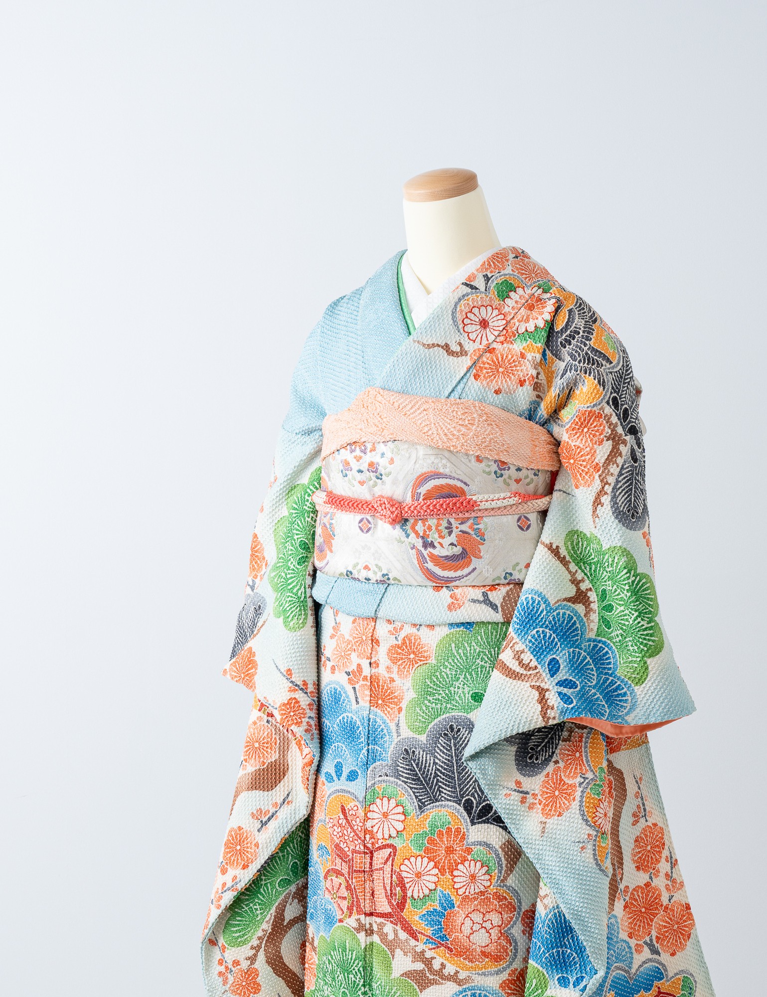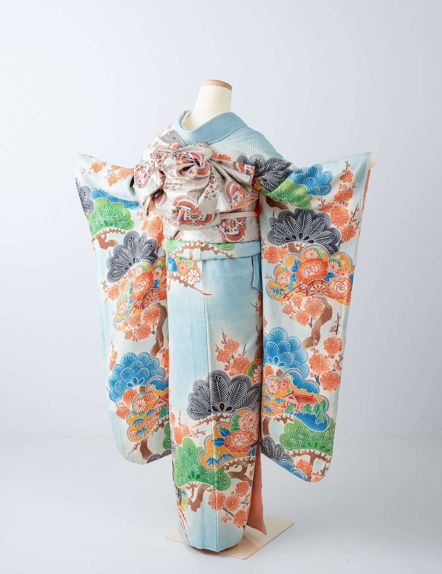 印象的な松や菊、黒鳥や御所車などが雅やかに描かれています。美しい空色に、青、緑、橙があざやかに映え、清楚なイメージと華やかさを持ちあわせた総絞りの振袖です。