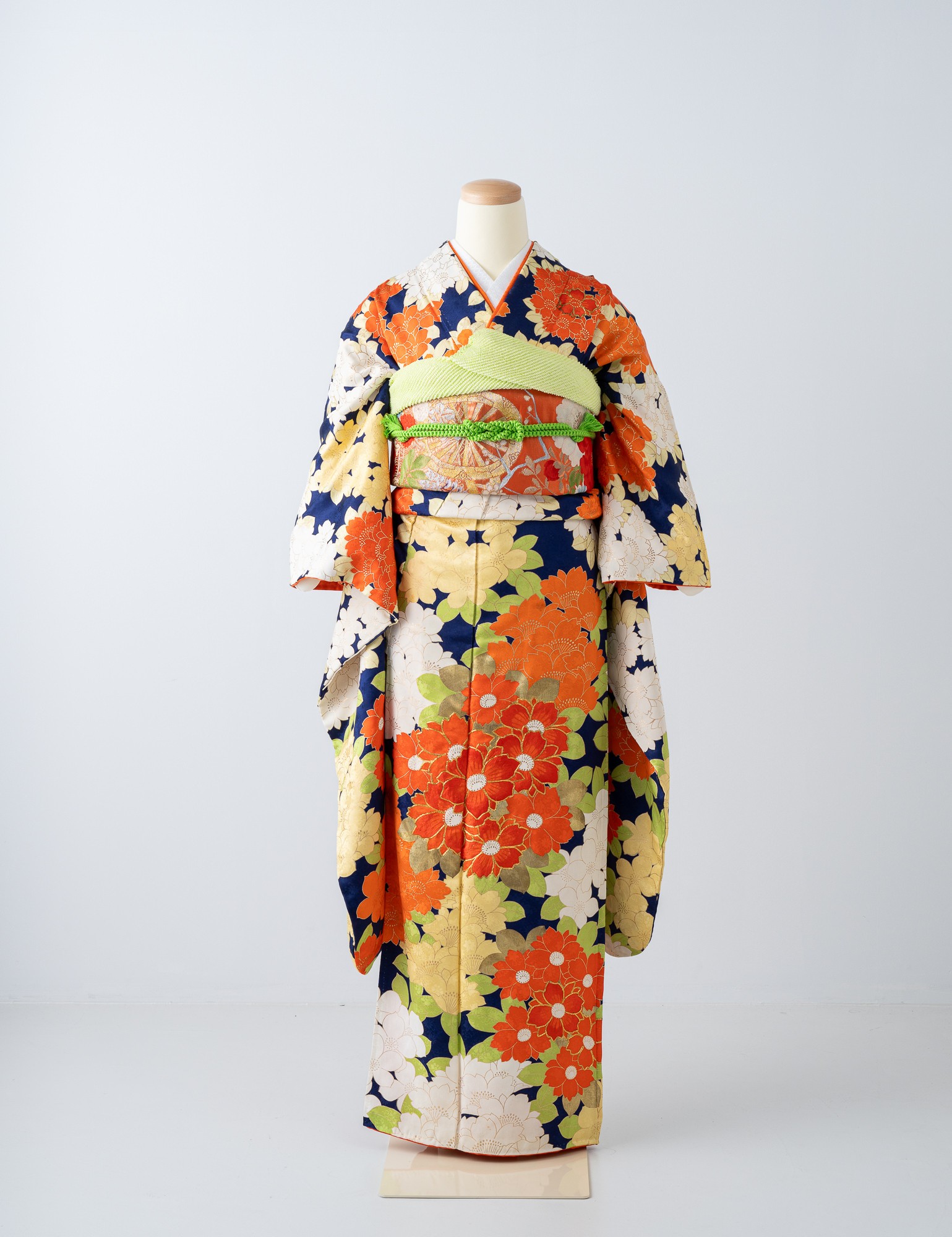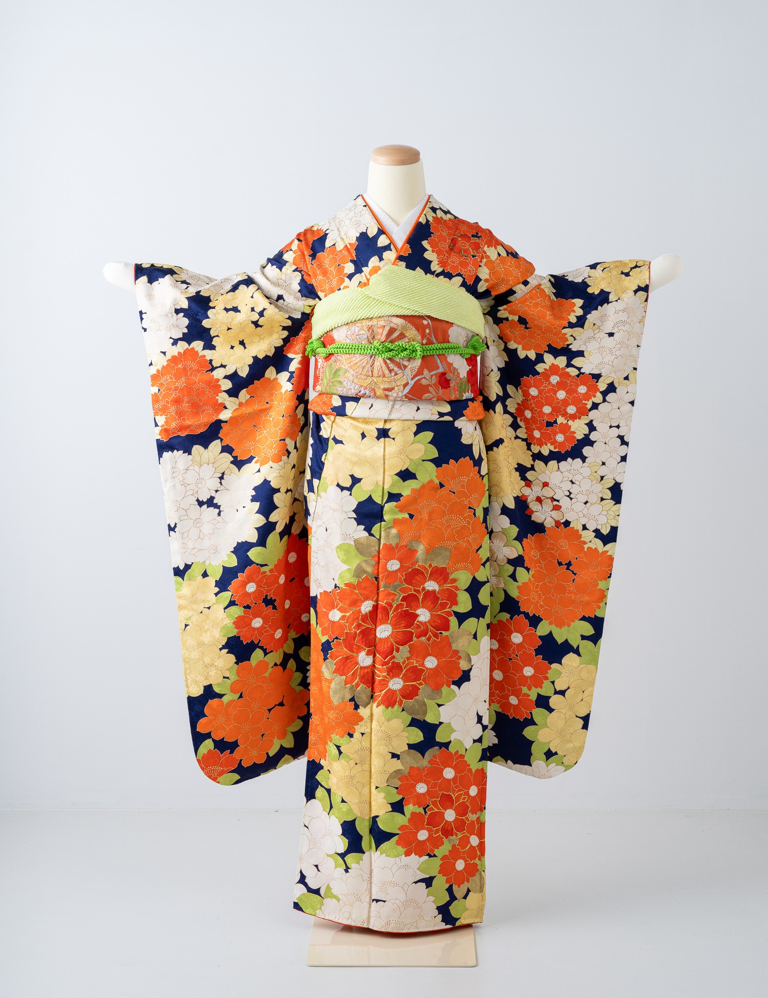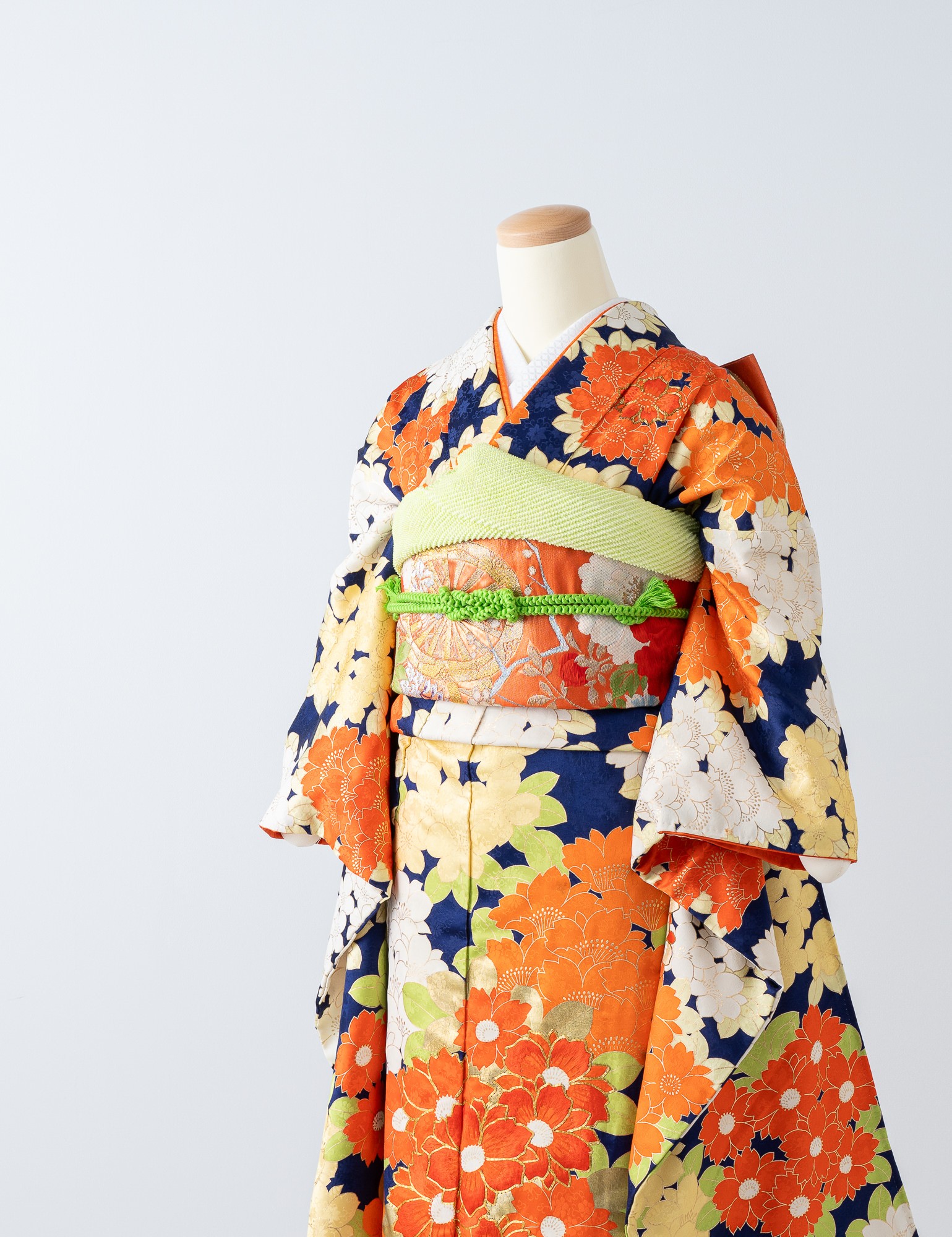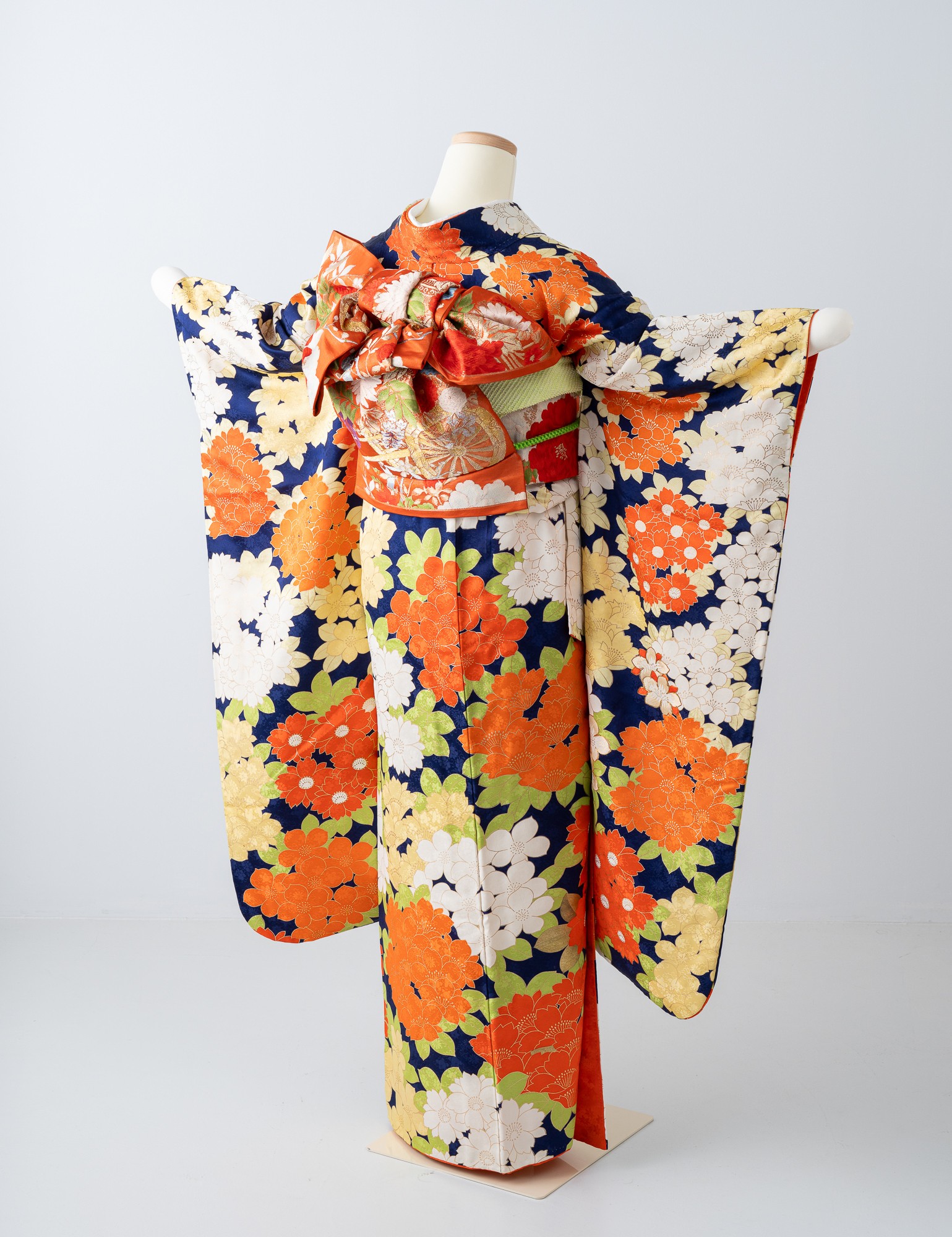 あざやかな橙、白、黄色の花々が大胆に描かれ、紺地とのコントラストが目を引く彩り豊かな振袖。金彩が花を引き立て、格調高く可憐な印象を与えます。