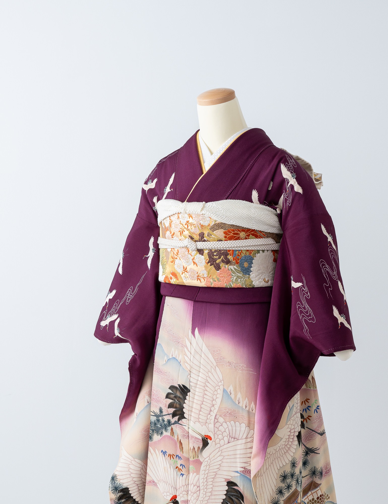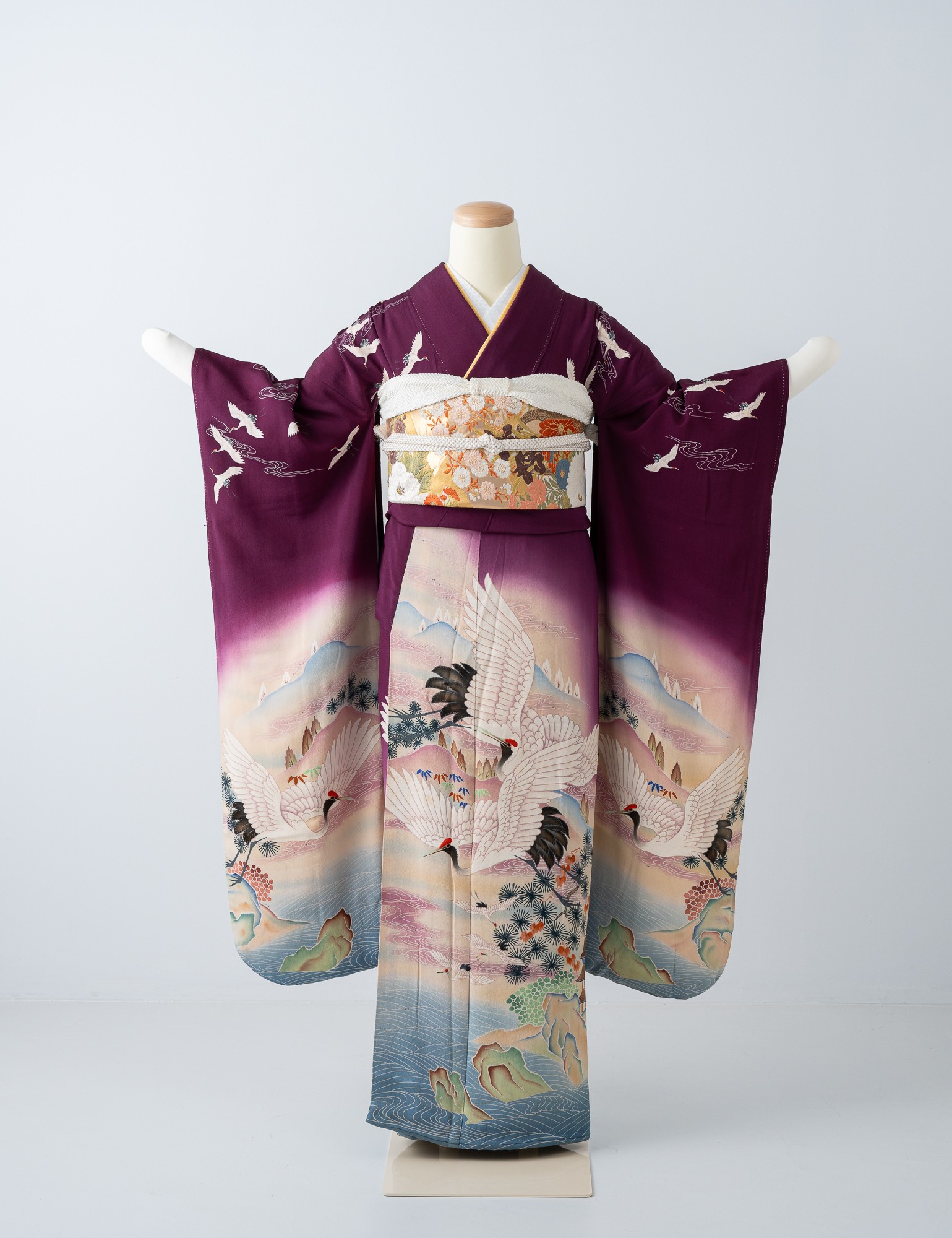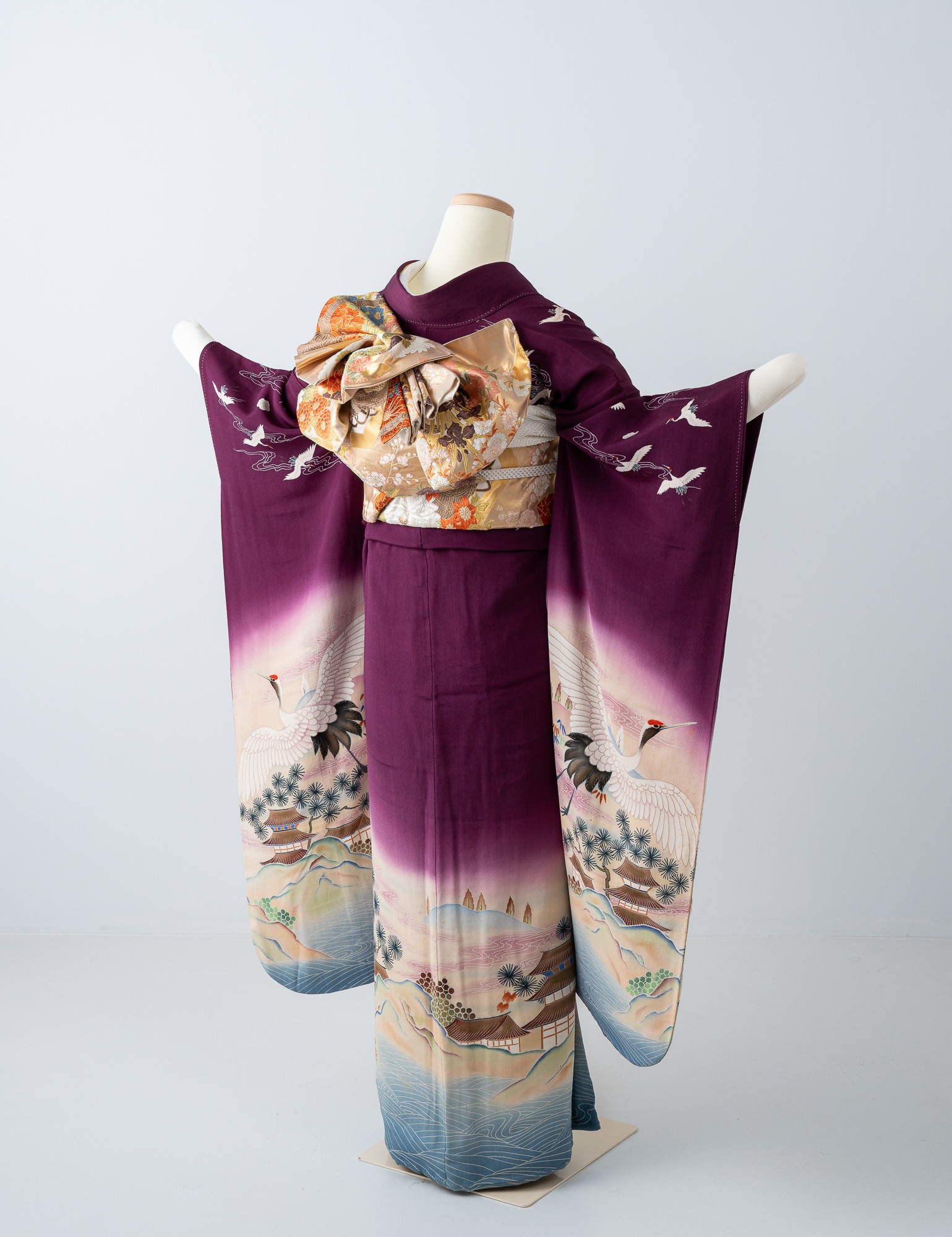 深い紫色を基調に、裾には風景文様とともに飛翔する鶴が描かれています。長寿や幸運の象徴である鶴・波・松の組み合わせは縁起も良く、品格のある意匠の振袖です。