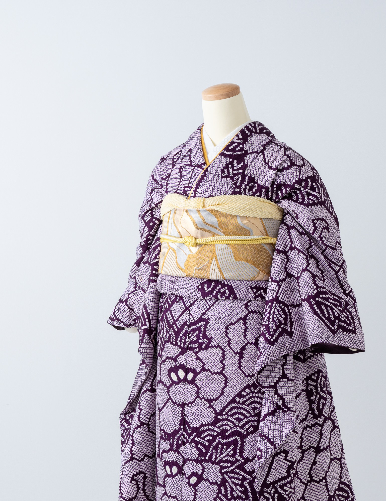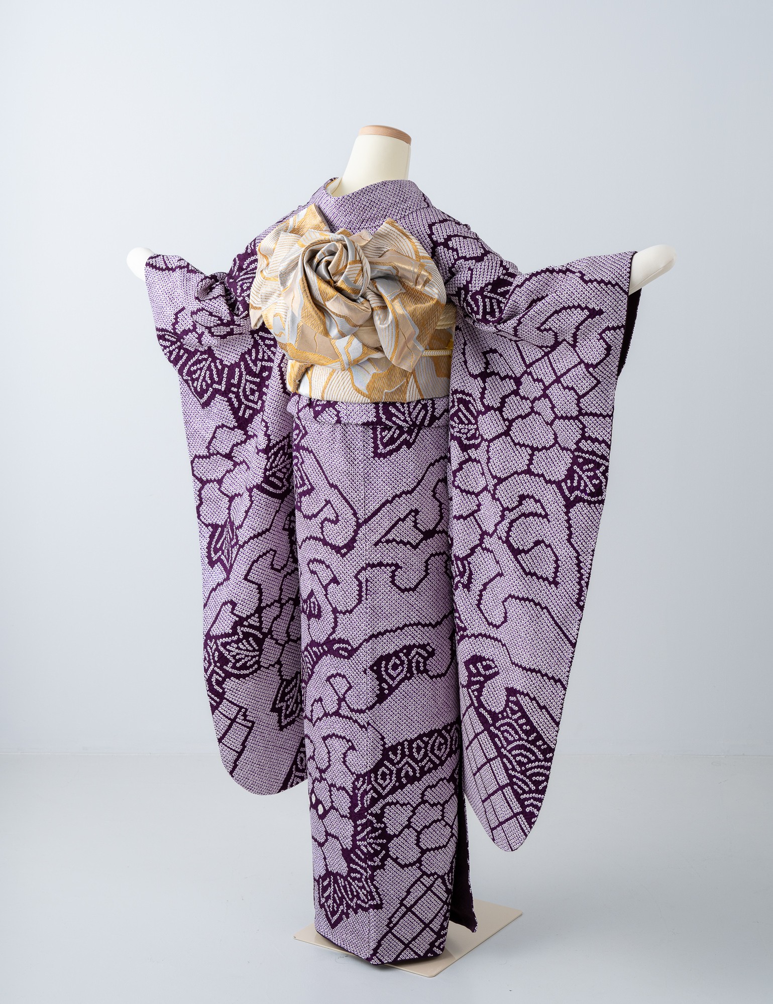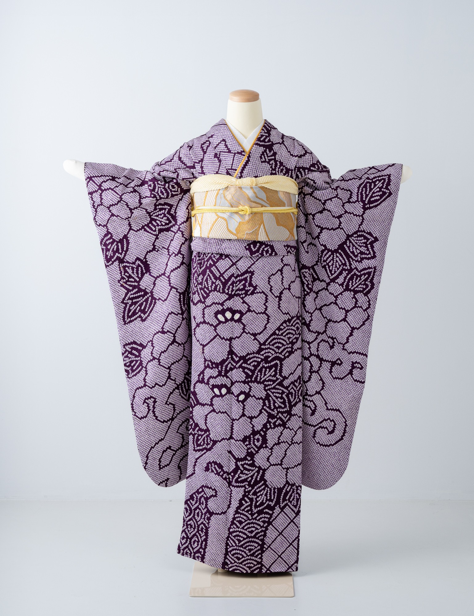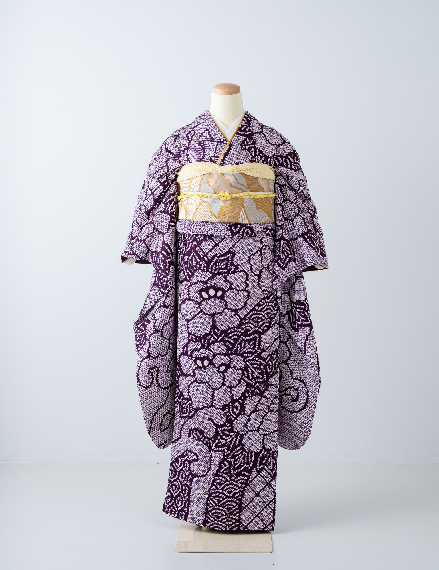 贅沢な総絞りに、大胆な牡丹や波文様などが描かれた上品な振袖。濃淡の紫が織りなすコントラストが、華やかさと落ち着きをかね備えた優雅な装いを演出します。