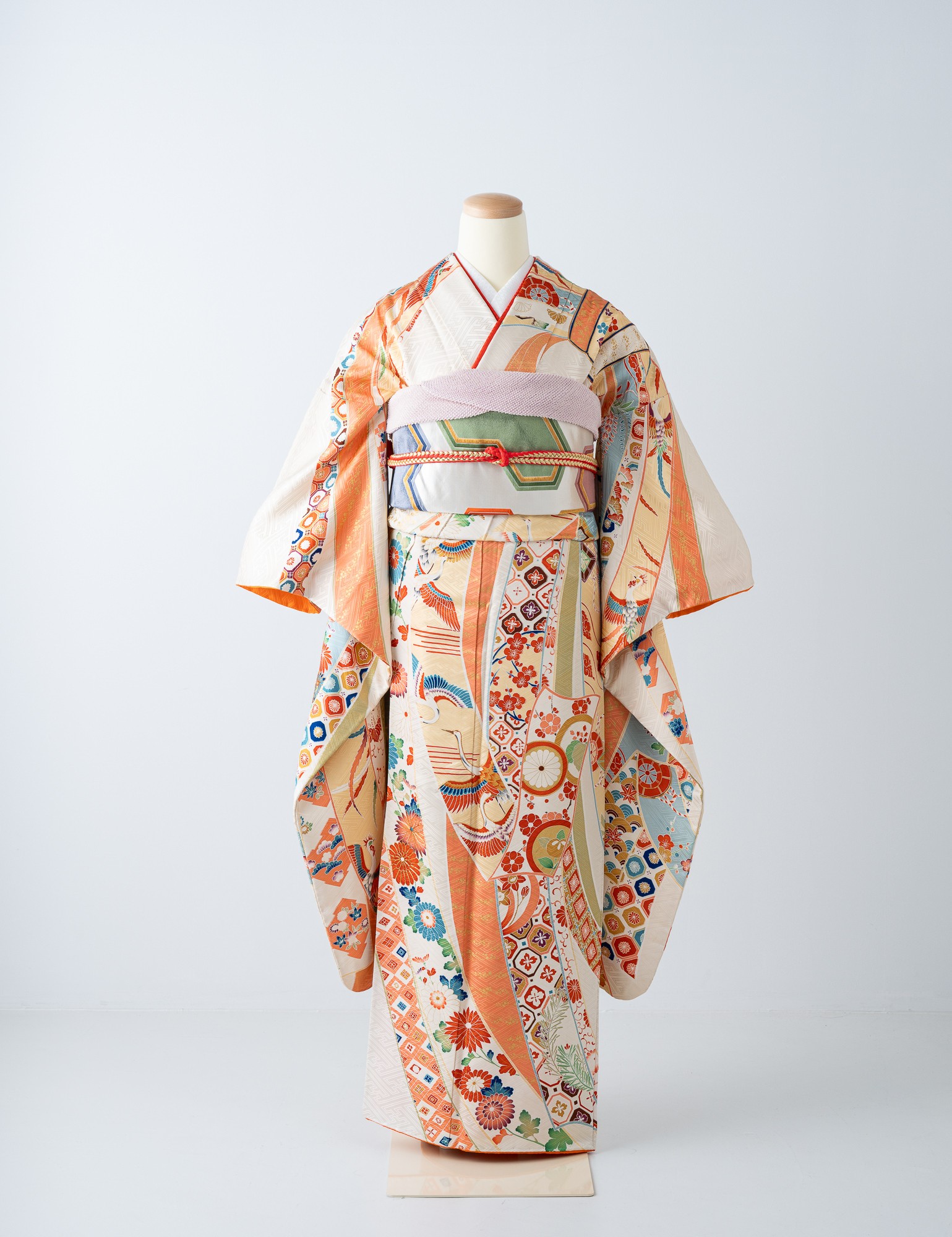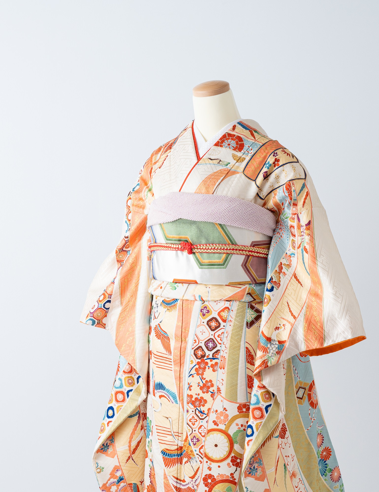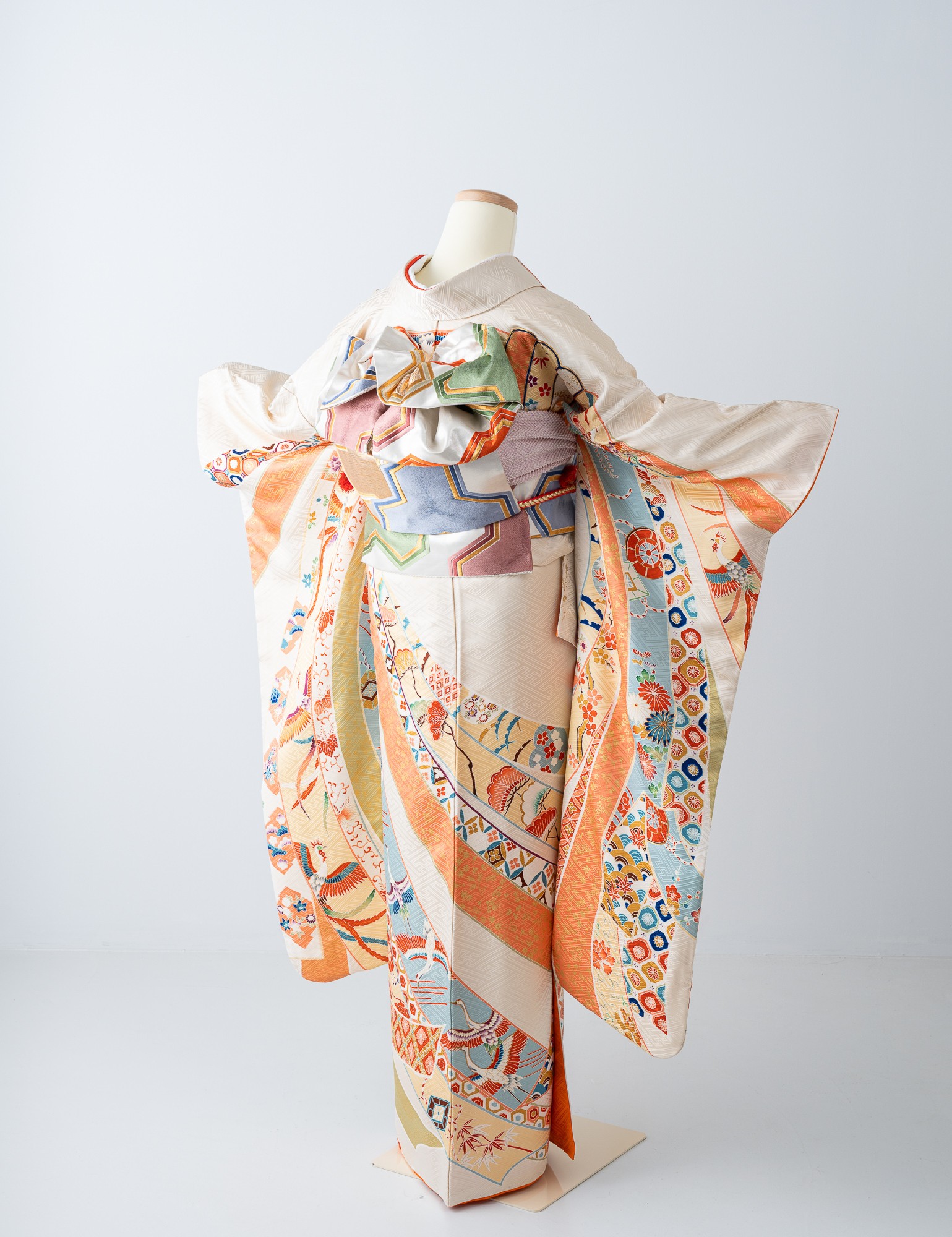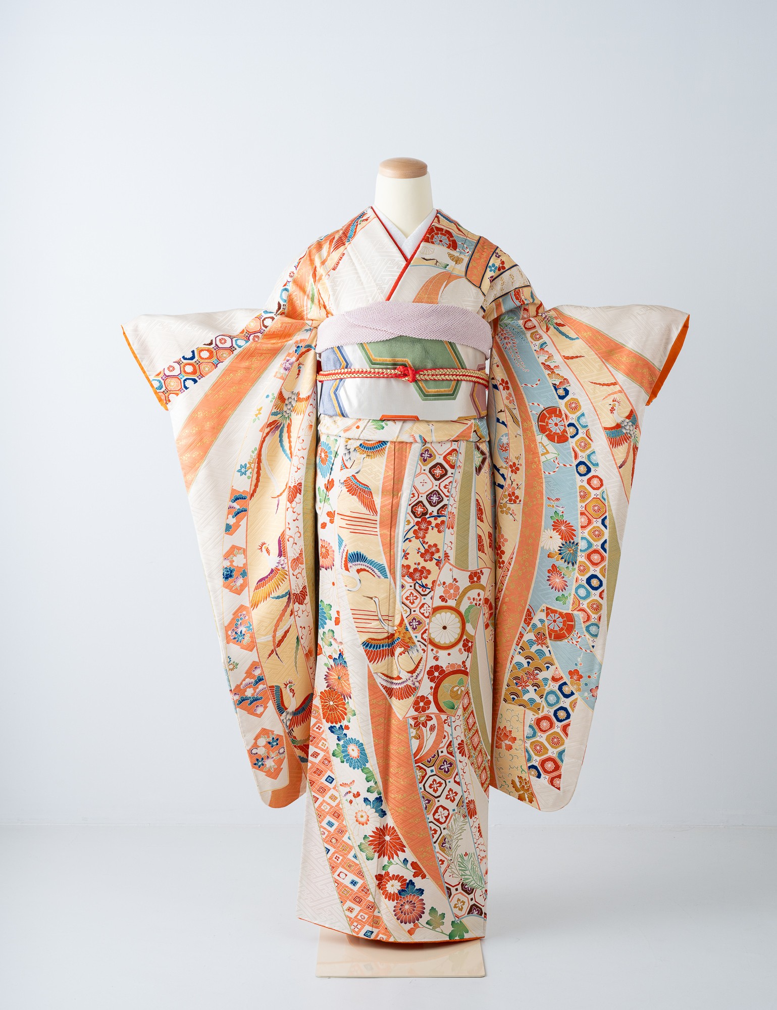大胆に流れる熨斗の中に飛鶴や草花など吉祥文様が描かれたとても華やかな振袖。束ねられたたくさんの熨斗は人と人との絆を表すともいわれています。