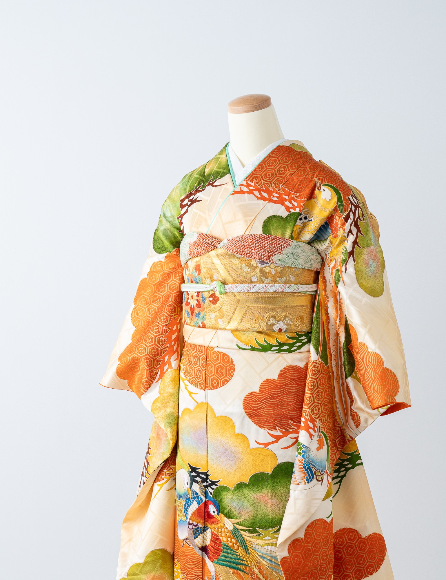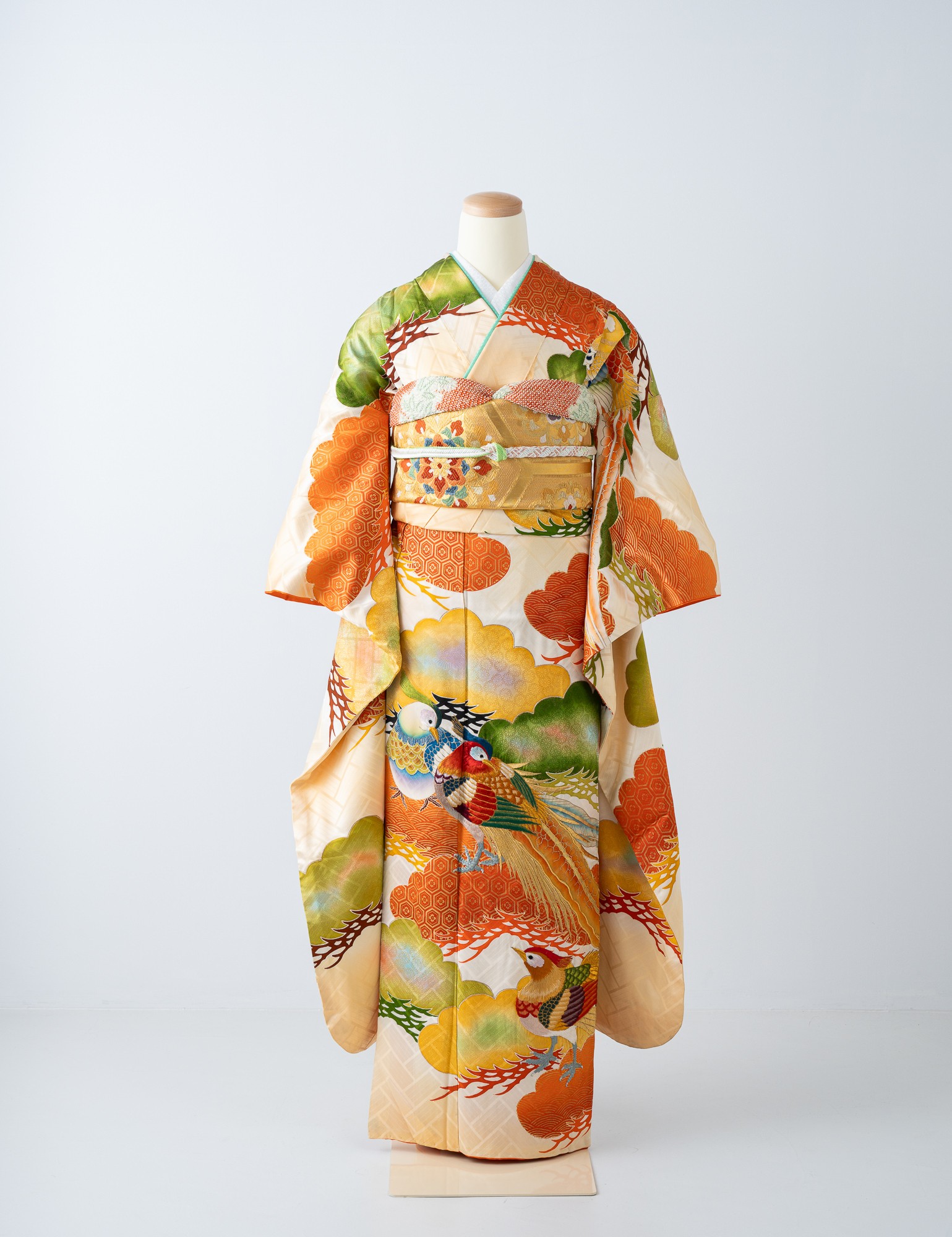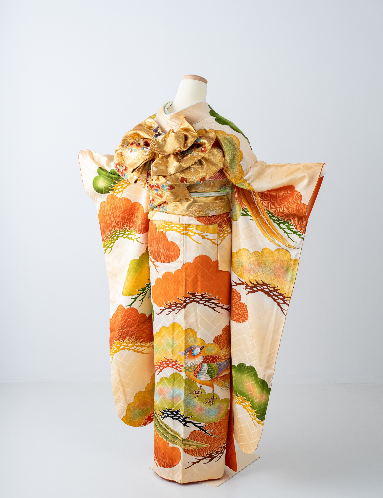 色あざやかで美しい鳥が印象的な振袖。全体に描かれた傘松には、亀甲、青海波などの幾何学文様がアクセントとなり華やかな印象を与えます。
