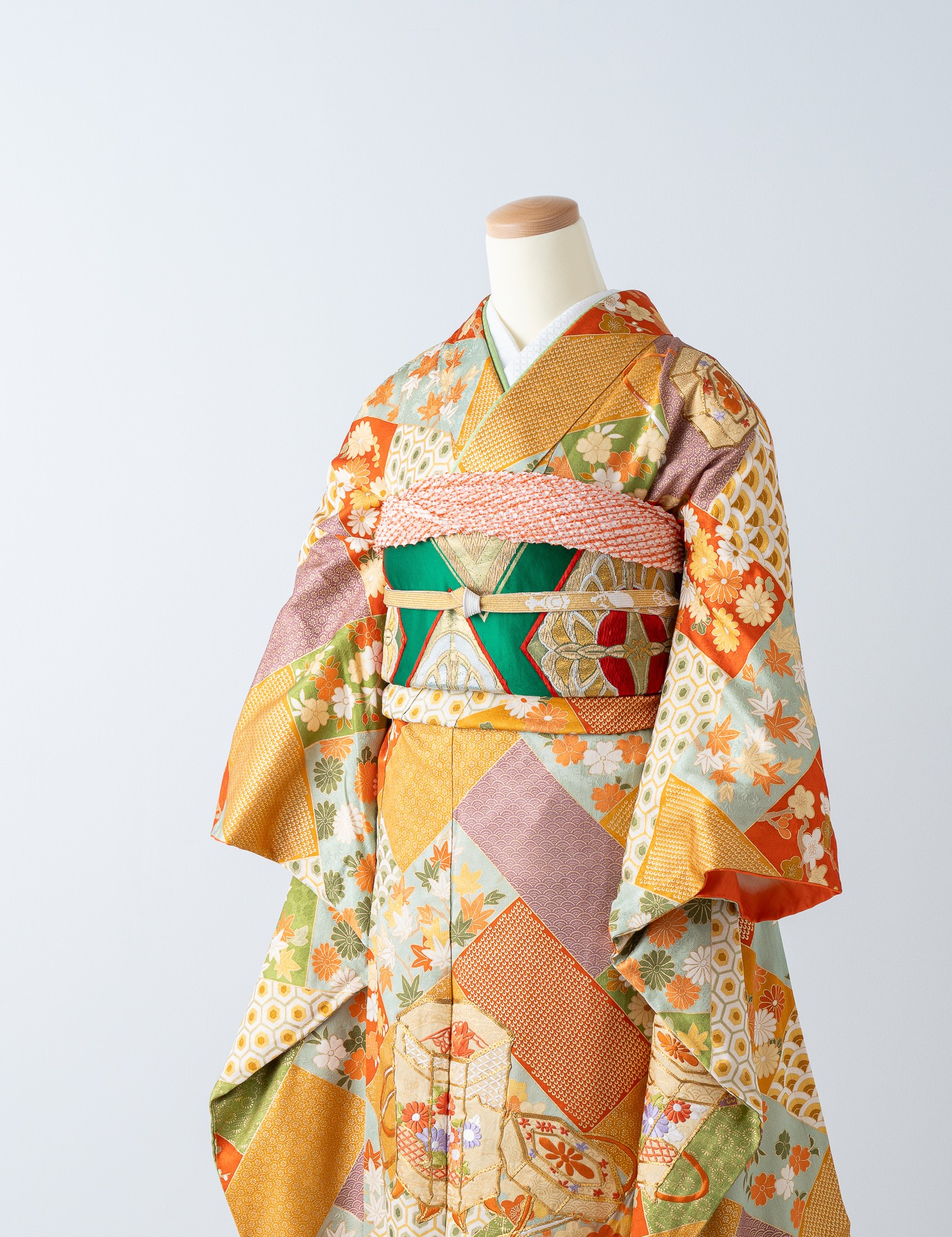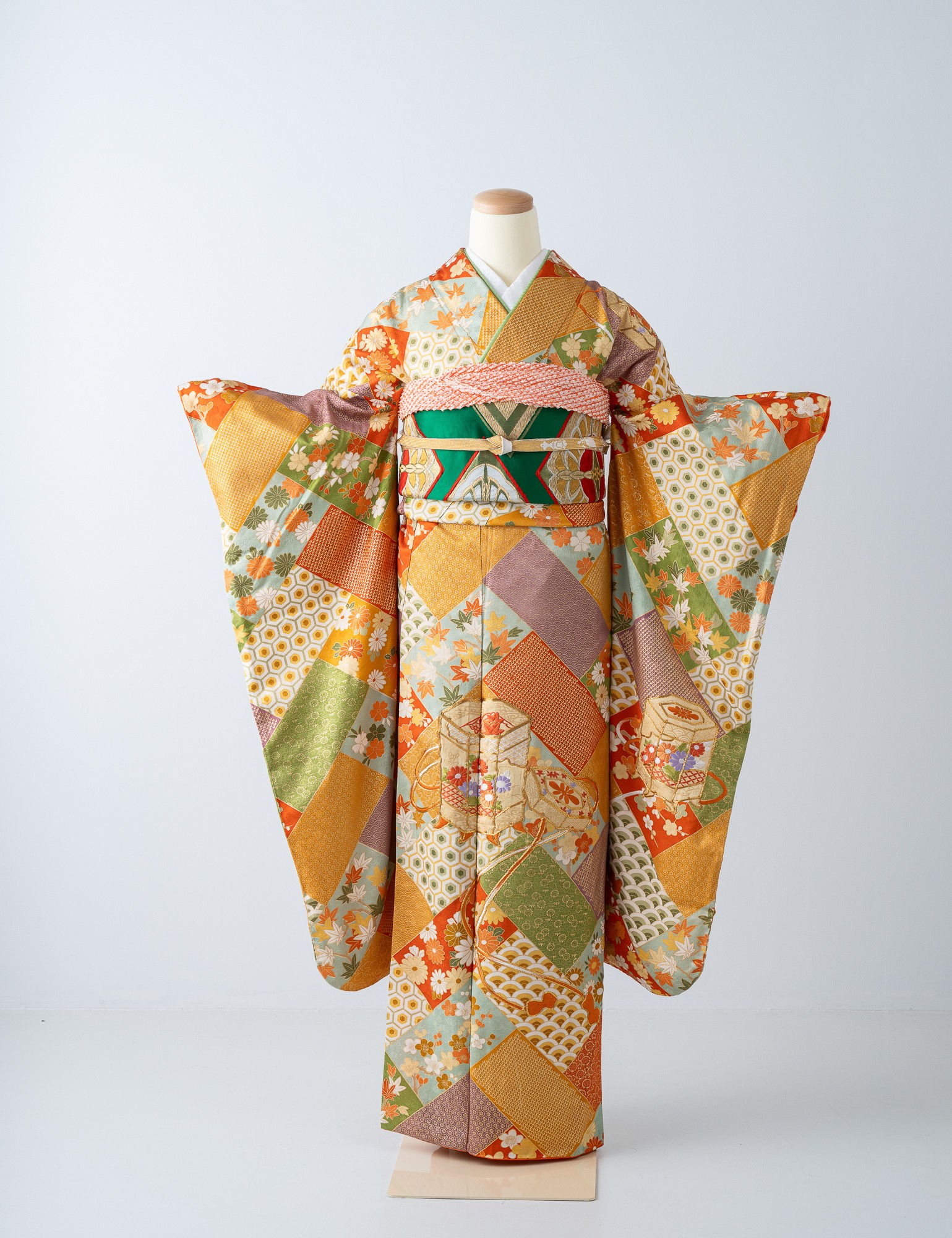 草花や割付文様がパッチワークのように散りばめられた振袖。橙や山吹、若草色、白茶などの色彩に、金駒刺繍の施された貝桶文がアクセントとなり雅やかな印象に。